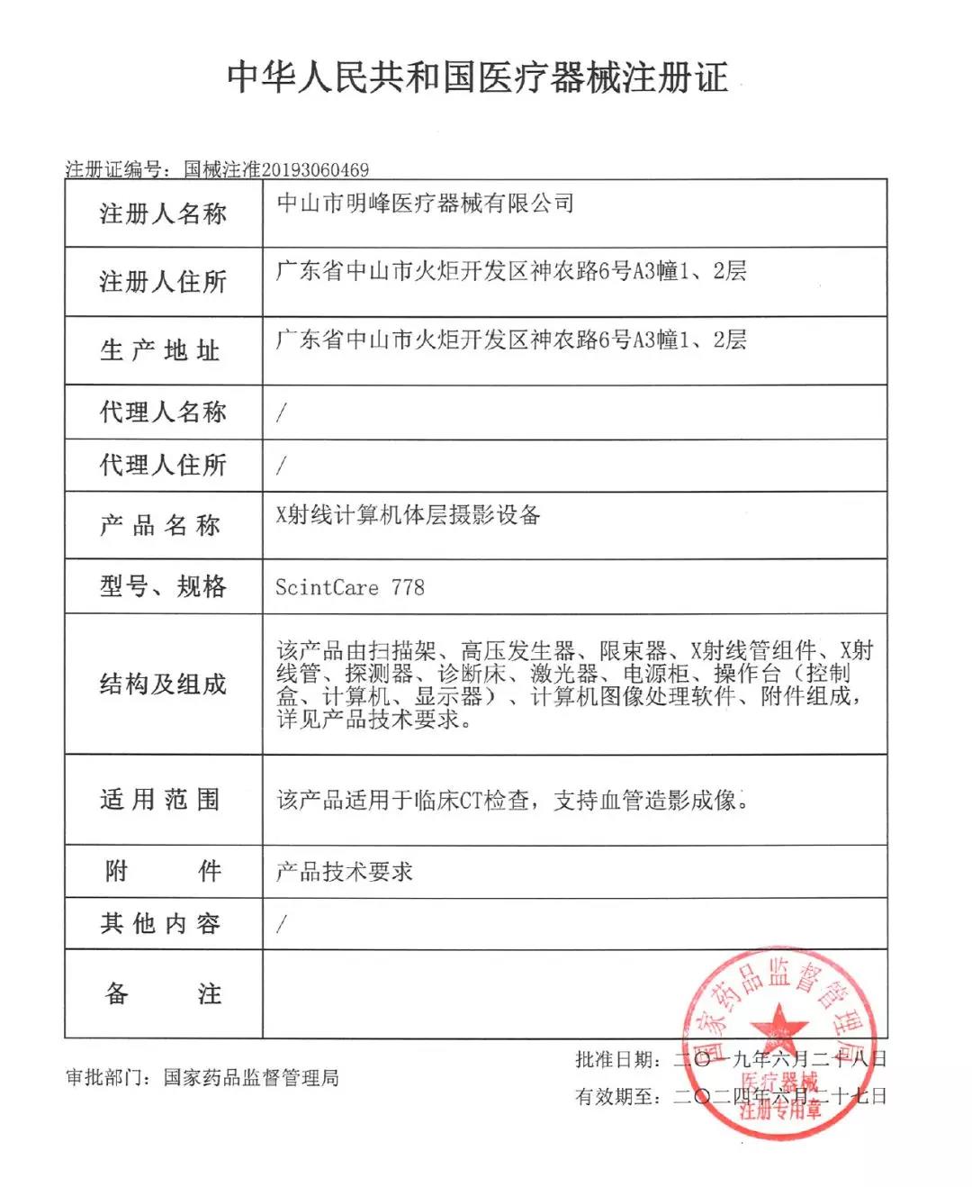 近日,國家健康基地園區(qū)企業(yè)——中山市明峰醫(yī)療器械有限公司迎來喜訊,其自主研發(fā)的128層CT機獲得了國家藥品監(jiān)督管理局頒發(fā)的醫(yī)療器械注冊證。