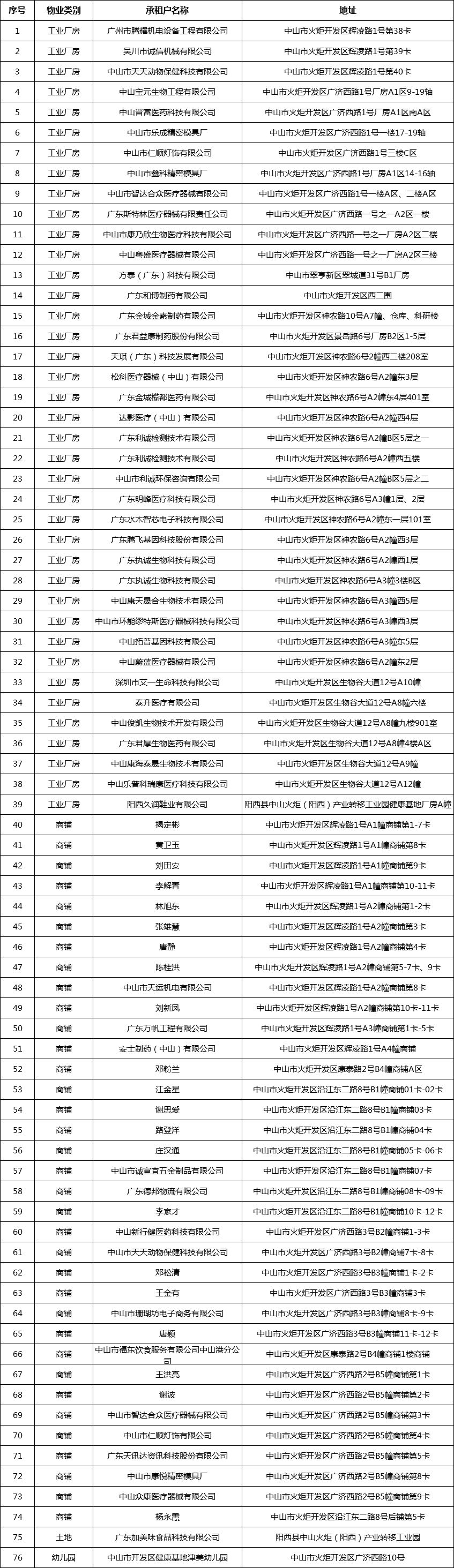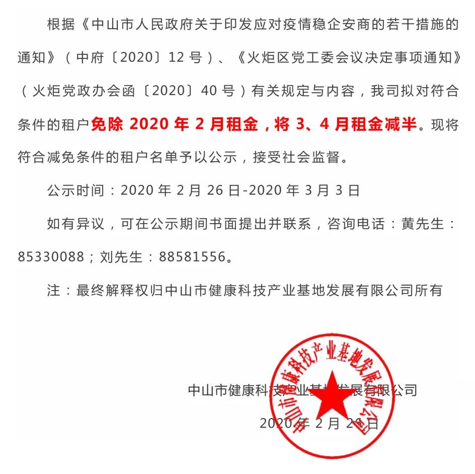 中山市健康科技產(chǎn)業(yè)基地發(fā)展有限公司關(guān)于經(jīng)營性物業(yè)、土地租金減免名單的公示