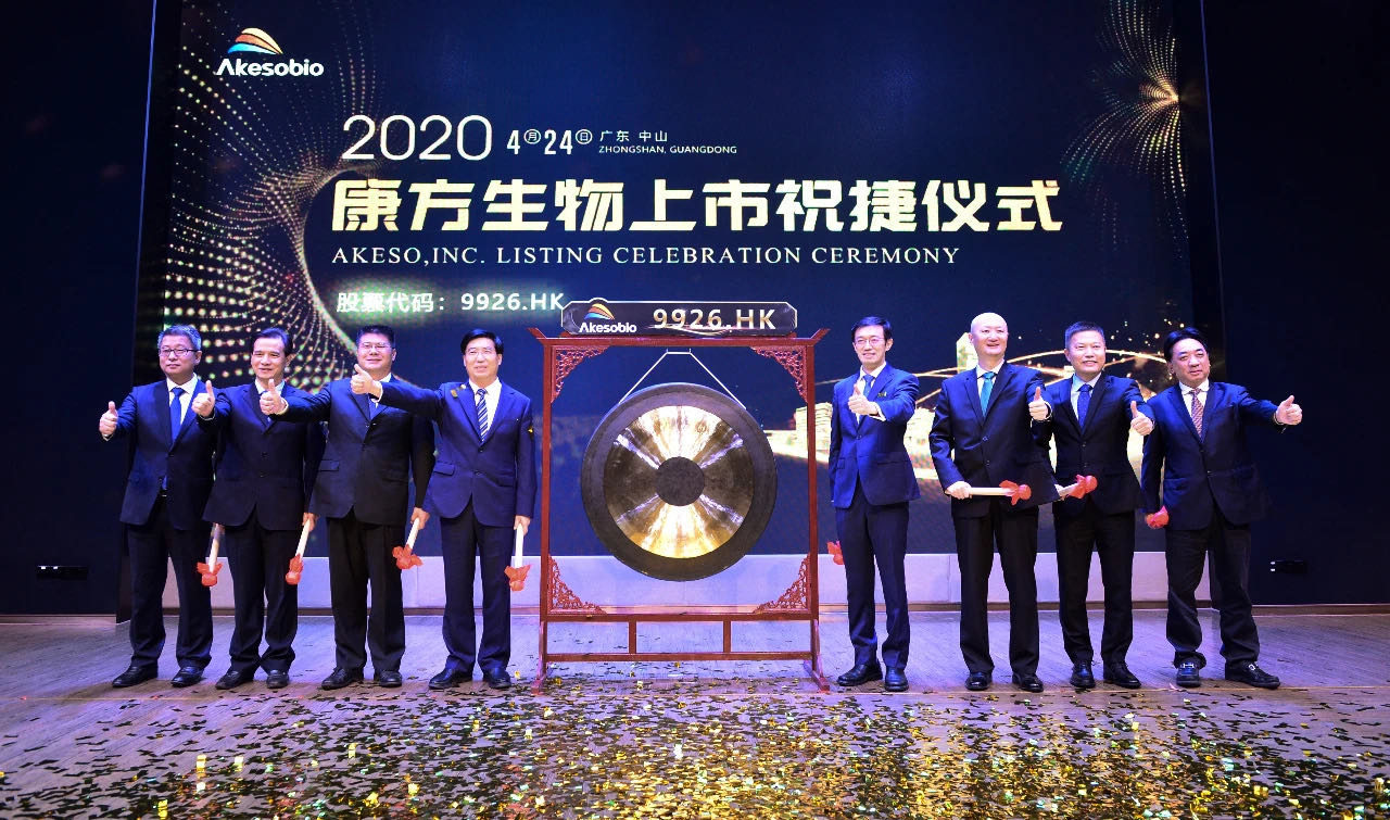 4月24日上午,健康基地園區(qū)企業(yè)康方生物(香港聯(lián)交所股份代碼:9926.HK)正式在香港聯(lián)合交易所掛牌上市。中山市領(lǐng)導(dǎo)賴澤華、陳文鋒、李長春、雷岳龍等出席康方生物上市祝捷儀式。上市首日康方生物大漲50.19%,收于24.30港元,市值達(dá)到185億港元。