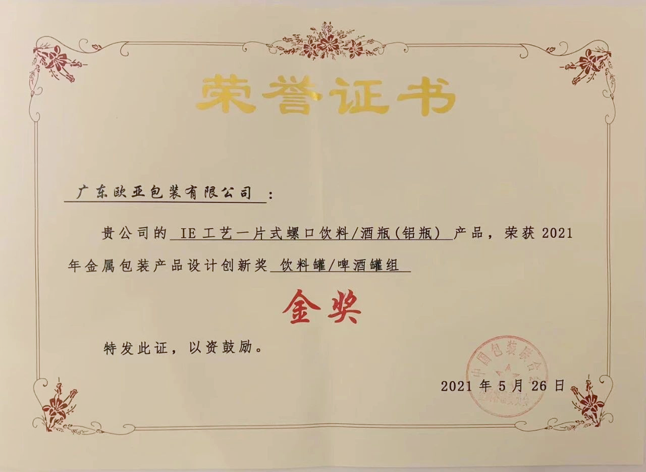 近日,在“2021年中國金屬包裝行業(yè)大會暨展覽會”上,健康基地園區(qū)企業(yè)廣東歐亞包裝有限公司(以下簡稱歐亞包裝公司)報送的“IE工藝一片式螺口飲料/酒瓶(鋁瓶)” 在眾多參評項(xiàng)目中脫穎而出,榮獲“2021年金屬包裝產(chǎn)品設(shè)計創(chuàng)新獎金獎”。
