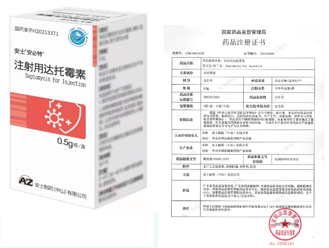 近日,安士制藥(中山)有限公司(以下簡稱“安士制藥”)持有并生產(chǎn)的注射用達托霉素0.5g安必特®獲得國家食品藥品監(jiān)督管理局的正式批準(zhǔn)。安士制藥在此品種上率先以新4類仿制藥獲批,為國內(nèi)首家視同過評產(chǎn)品。