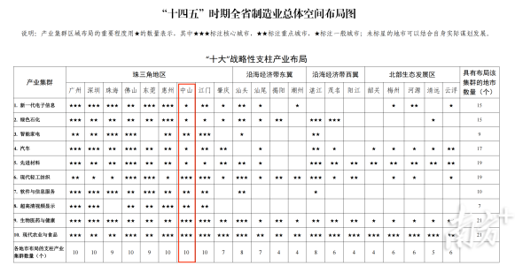《規(guī)劃》中,共有68處內(nèi)容直接提及中山。在“十大”戰(zhàn)略性支柱產(chǎn)業(yè)布局和“十大”戰(zhàn)略性新興產(chǎn)業(yè)布局中,有19個(gè)產(chǎn)業(yè)將中山作為布局城市。其中,現(xiàn)代輕工紡織、生物醫(yī)藥與健康、現(xiàn)代農(nóng)業(yè)與食品3個(gè)產(chǎn)業(yè)將中山列為核心布局城市。