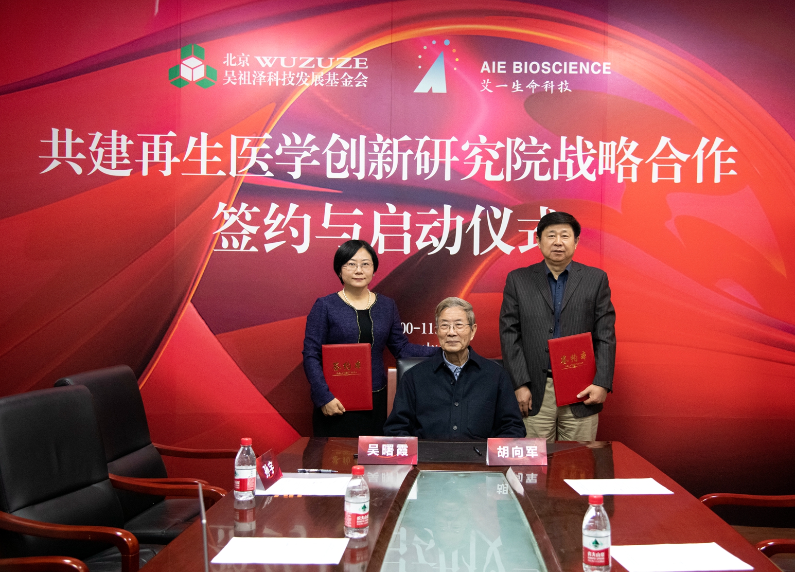 中國科學院院士吳祖澤,北京吳祖澤科技發(fā)展基金會理事長胡向軍、秘書長朱亮,清華大學出版社副總編孫宇,艾一生科副總經(jīng)理吳曙霞、干細胞實驗室主任李玉霞等出席簽約儀式。
