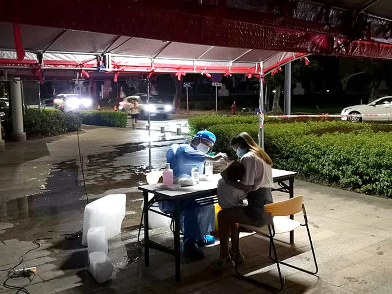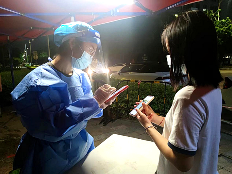 白天驕陽似火、烈日炎炎,一線醫(yī)務人員、企業(yè)志愿者們穿上防護服忍受悶熱,克服困難,一絲不茍做好核酸檢測工作;晚上披星戴月,舍小家為大家,堅守崗位,齊心協(xié)力守護園區(qū)。他們忙碌的身影也成為現(xiàn)場最美的風景線。