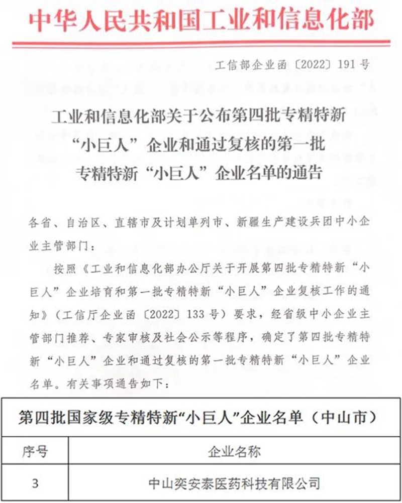 近日,第四批國家級專精特新“小巨人”企業(yè)名單發(fā)布,健康基地園區(qū)企業(yè)中山奕安泰醫(yī)藥科技有限公司(以下簡稱“奕安泰”)榜上有名。一直以來,健康基地把科技創(chuàng)新作為引領(lǐng)發(fā)展的第一動力,打造差異化競爭優(yōu)勢,培育了一批有持續(xù)創(chuàng)新力和競爭力的優(yōu)質(zhì)企業(yè)。目前,健康基地還擁有7家省級專精特新企業(yè)、2家市級專精特新及單項冠軍培育企業(yè)。
