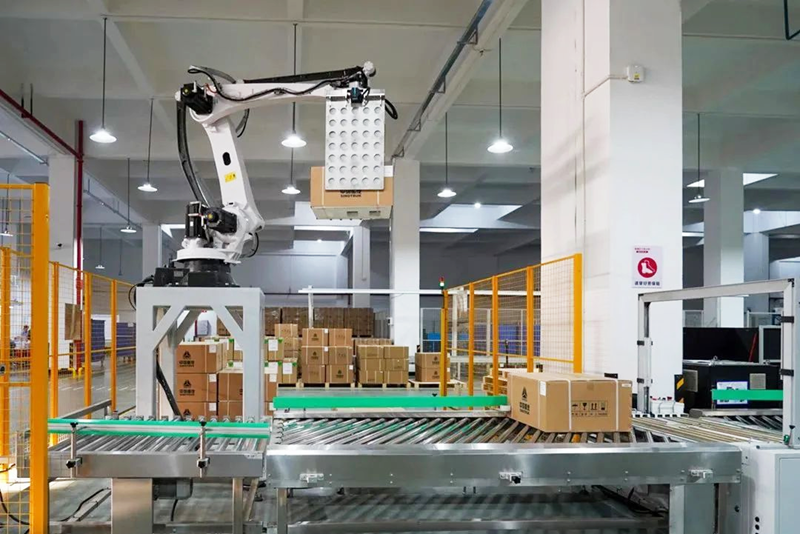 巨大的機(jī)械臂將成品整齊堆放入庫。記者馮明旻攝