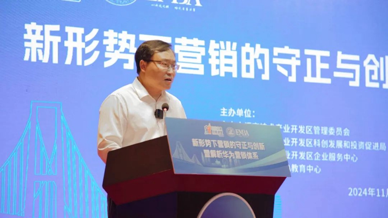 中山火炬開發(fā)區(qū)黨工委委員、管委會副主任肖宜東致辭,他指出本次活動旨在共同探討營銷領域的最新創(chuàng)新理念、技術趨勢、成功案例和政策資訊,進一步促進政產(chǎn)學研合作,優(yōu)化營商環(huán)境,并推動區(qū)域創(chuàng)新與企業(yè)高質(zhì)量發(fā)展。他表示,在全球化和數(shù)字化浪潮下,企業(yè)要在競爭中立于不敗之地,就必須把企業(yè)的發(fā)展融入到國家發(fā)展大局中,不斷探索適應市場變化的營銷策略。希望大家能從本次活動中汲取智慧和靈感,結合各自企業(yè)的實際,探索適合企業(yè)發(fā)展的營銷創(chuàng)新之路。