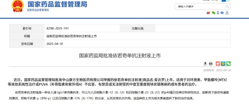 第7個(gè)自主創(chuàng)新藥!康方生物愛達(dá)羅®(依若奇單抗,IL-12/IL-23“雙靶向”單克隆抗體)獲批上市