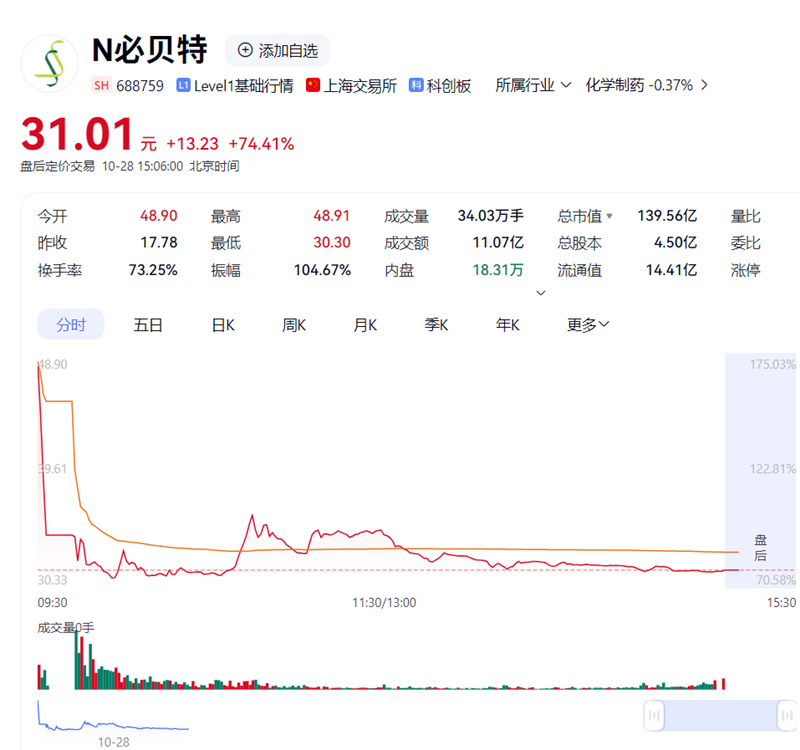上市首日,必貝特醫(yī)藥開盤價(jià)為48.90元/股,較發(fā)行價(jià)17.78元/股大幅上漲174.91%,截至今日收盤,股價(jià)報(bào)31.01元,總市值139.56億元。