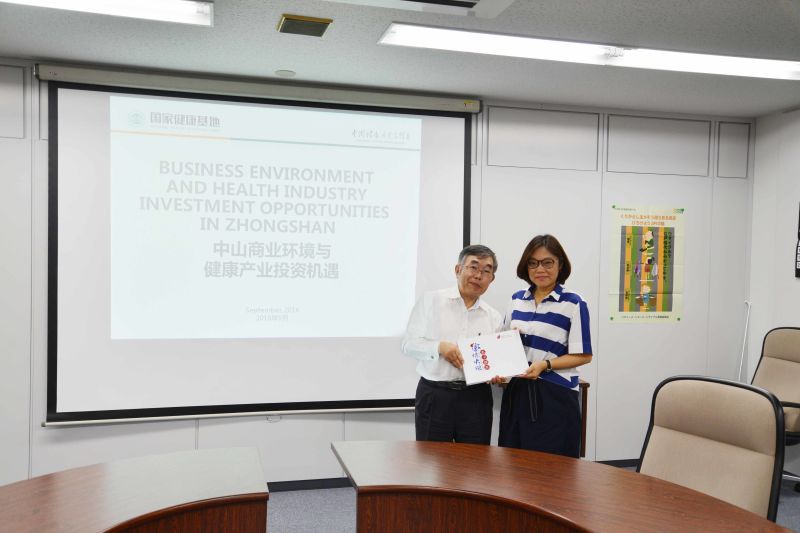 國家健康基地總經(jīng)理方迎向日本OTC醫(yī)藥品協(xié)會(huì)海外事務(wù)負(fù)責(zé)人西沢元仁贈(zèng)送火炬區(qū)畫冊(cè)