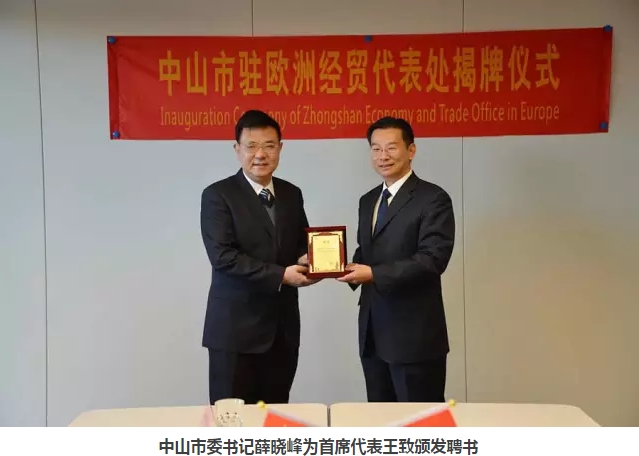 在揭牌儀式上,薛曉峰表示,中山市駐歐州經(jīng)貿(mào)代表處的成立是中山扎根歐洲開展雙邊經(jīng)貿(mào)合作的開始,希望代表處發(fā)揮好信息傳遞、城市推介、招商引資、對接交流等職能,加快推動中山中瑞(歐)工業(yè)園的建設,探索出中山與歐州合作的創(chuàng)新模式,同時薛曉峰書記向獲聘任的代表處首席代表頒發(fā)了聘書。