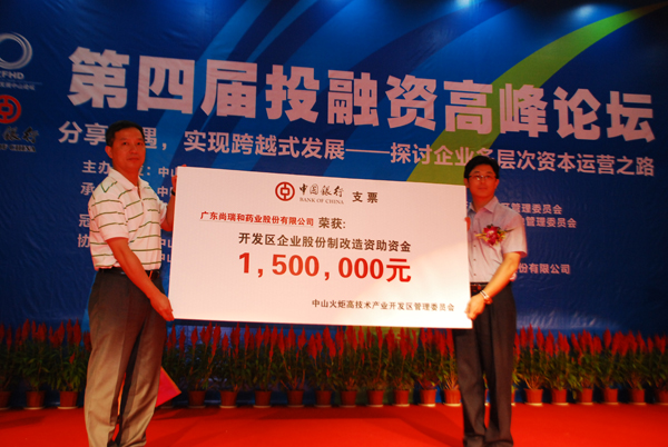 本網(wǎng)訊 在8月26日第六屆“健康與發(fā)展”中山論壇和2011年吳階平醫(yī)學(xué)獎(jiǎng)?lì)C獎(jiǎng)大會(huì)新聞發(fā)布會(huì)舉辦的當(dāng)天,第四屆投融資高峰論壇如期舉行。大會(huì)上,中山首只行業(yè)基金——中山健康科技產(chǎn)業(yè)股權(quán)投資基金在論壇現(xiàn)場揭牌,并啟動(dòng)3億元的首期基金。現(xiàn)場還舉行了開發(fā)區(qū)已完成股改企業(yè)的頒獎(jiǎng)儀式。